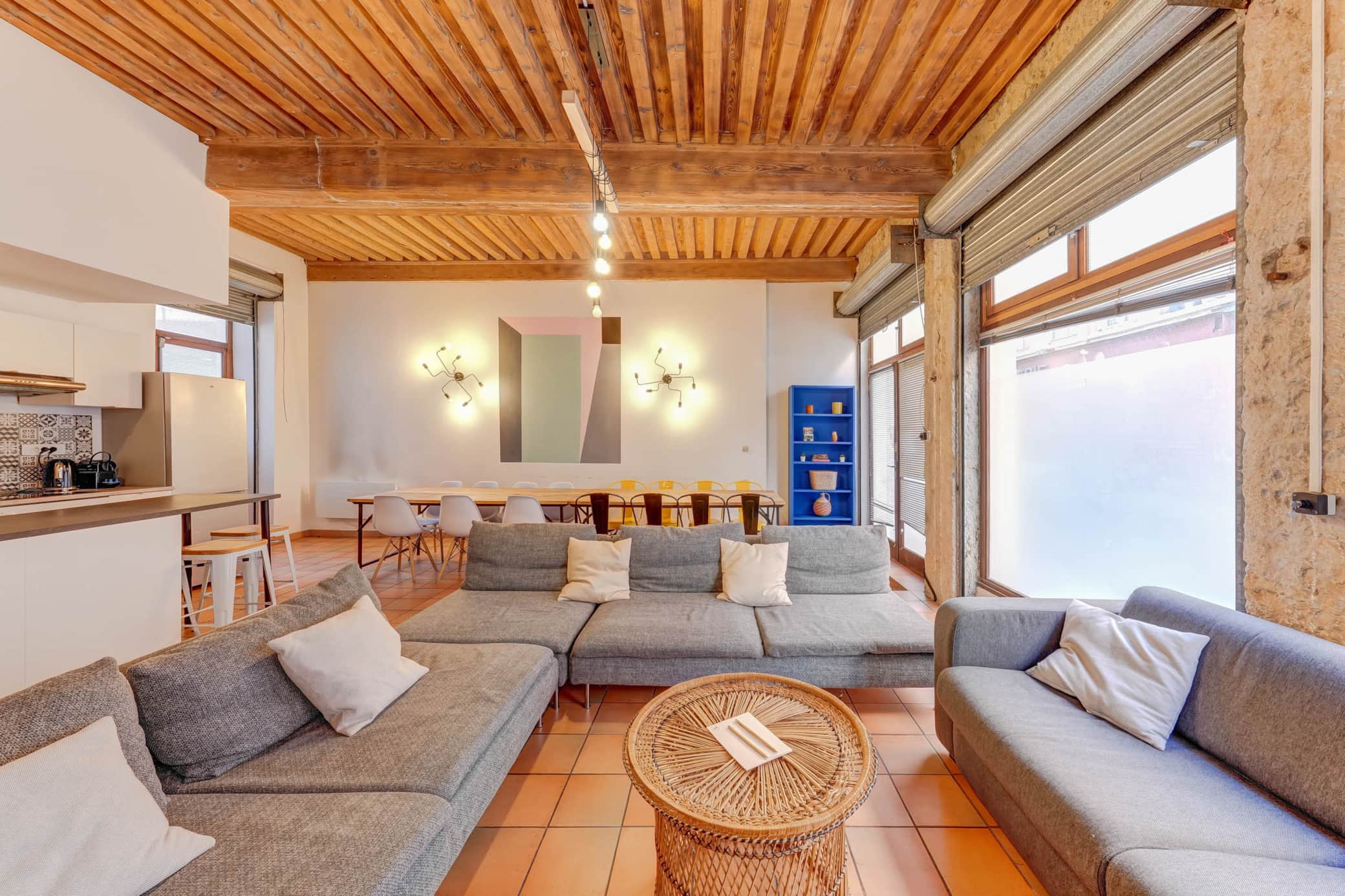 NOCNOC vous accueille au Canut. Cet appartement pouvant accueillir jusqu'à 20 voyageurs se situe au rez-de-chaussée d'un immeuble situé dans les Pentes de la Croix Rousse. Le Canut est divisé en deux parties, séparées par le couloir d'entrée de l'immeuble. L'appartement comprend un espace salon avec cuisine, table à manger, une salle de bain avec WC et canapé convertible puis un coin nuit avec 7 chambres, 2 canapés convertibles, 2 douches, une machine à laver et 2 toilettes.